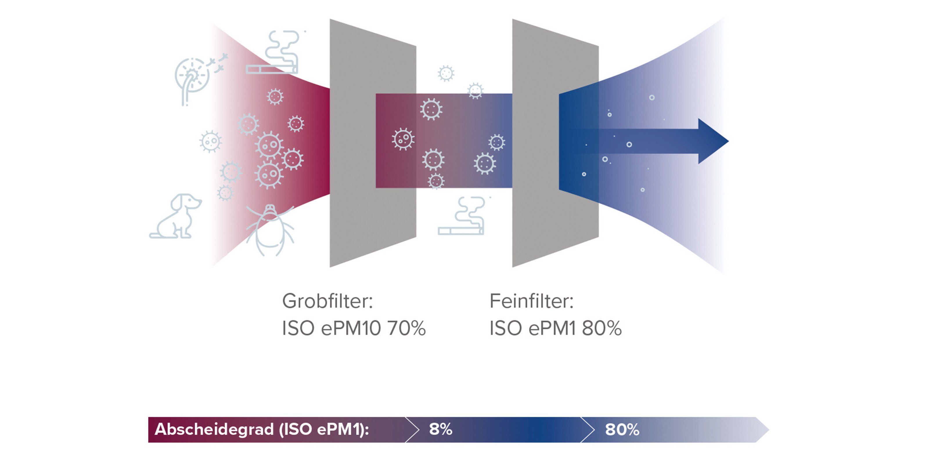 • ISO ePM1: Filtert die kleinsten Partikel von 0,3 µm bis 1 µm, einschließlich Nanopartikeln, Ruß und Viren.