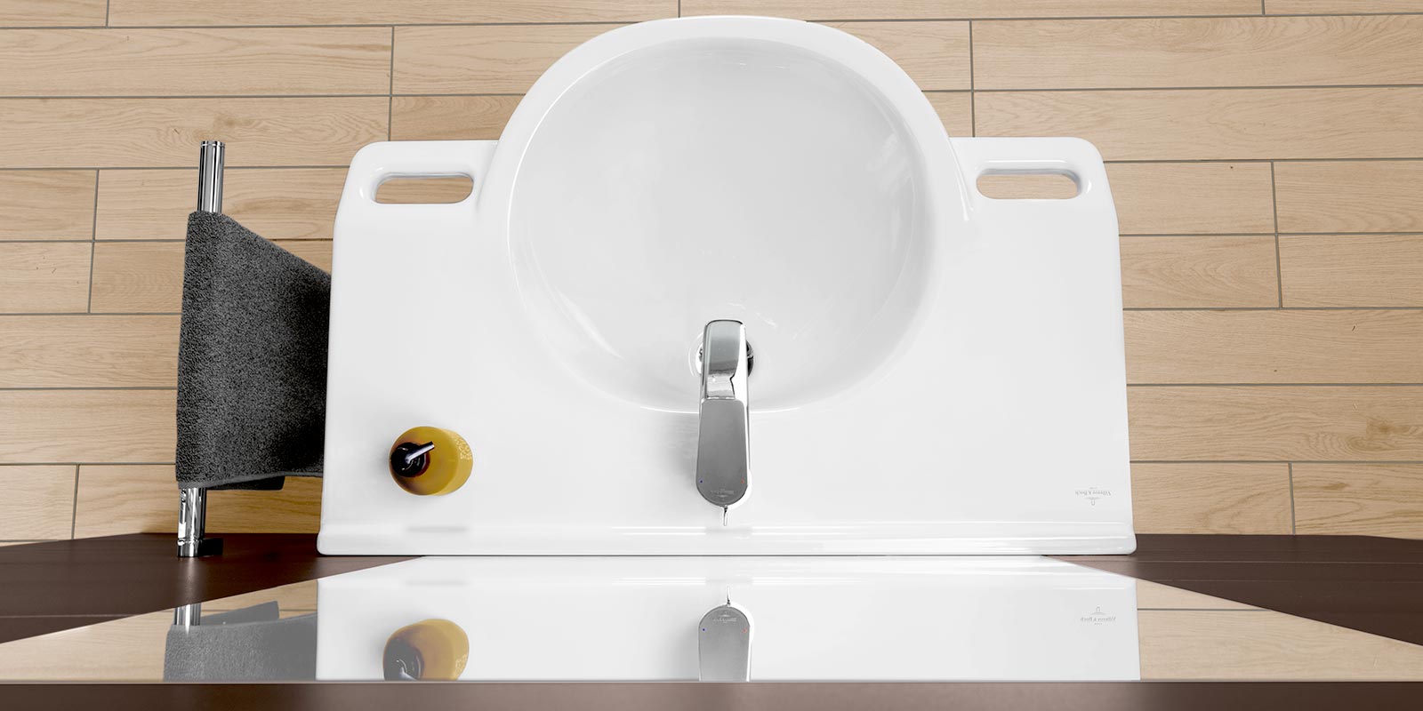 Ein modernes Waschbecken mit einem eleganten Wasserhahn und einem Handtuchhalter, umgeben von stilvollen Fliesen.