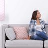 1. Eine Junge Frau sitzt in einem Raum auf der Couch mit der Fernbedienung für die Klimaanlage die an der Wand über Ihr ist. Aus der Klimaanlage kommt kühle Luft, und die Frau atmet Tief und lächelt.