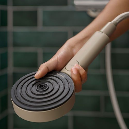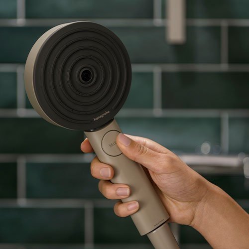 So schließt sich der Kreislauf: Getreu dem Nachhaltigkeitsprinzip „Reduce, Reuse, Recycle“ besteht der Griff der Handbrause aus einem Kunststoffrezyklat. Der einzigartige Prozess für die Gewinnung dieses Rohstoffs wurde speziell bei Hansgrohe entwickelt. Dieser aus Altprodukten und Ausschussware gewonnene ABS (Acrylnitril-Butadien-Styrol-Copolymer) beschichtete Kunststoff wird zerkleinert und gereinigt. Anschließend folgt die Umwandlung in ein hochwertiges Granulat. Mit dieser Alternative zu erdöl- und fossilbasierten Primärkunststoffen gelingt eine erhebliche Senkung des Energieverbrauchs bei der Produktion. Das Material selbst bietet eine elegante Optik in Sandfarben. Die Handbrause ist komplett chromfrei gefertigt. Alle eingesetzten Rohstoffe sind recyclebar.